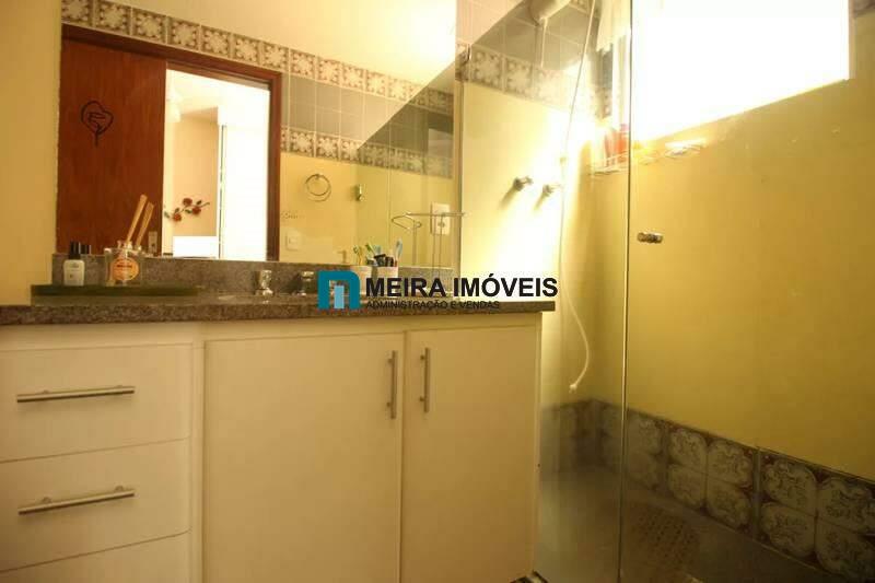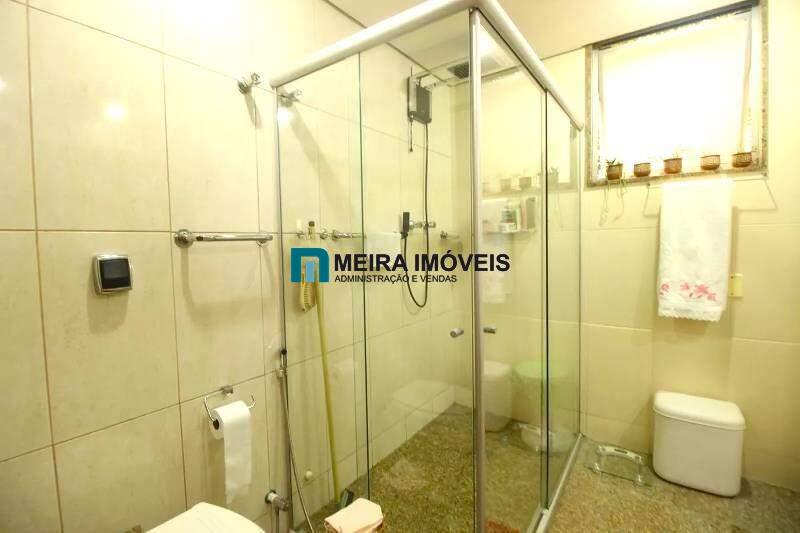 Banheiro social com bancada em granito, espelho, armários e box em blindex